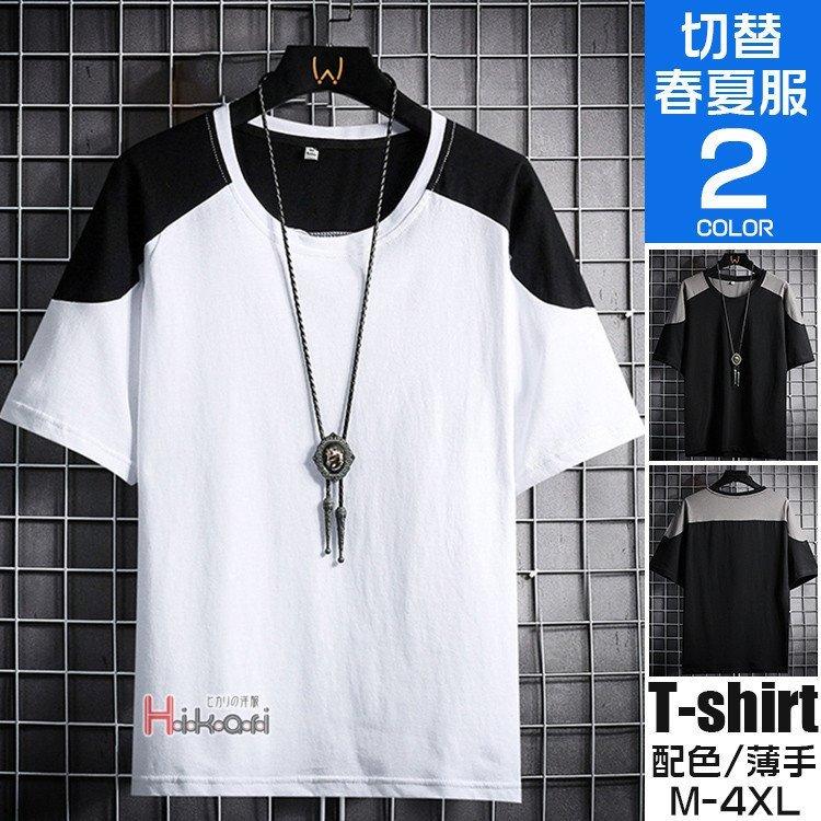 メンズtシャツ切り替え半袖白tシャツカジュアル黒夏服おしゃれルームウェア 完売